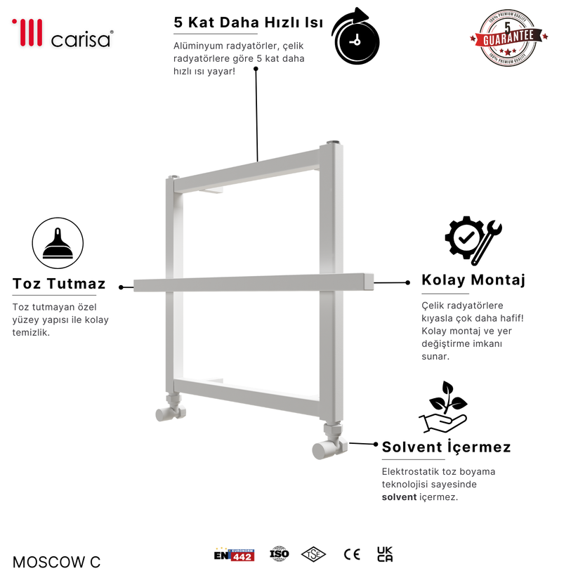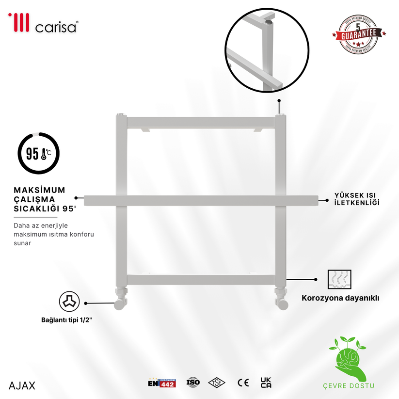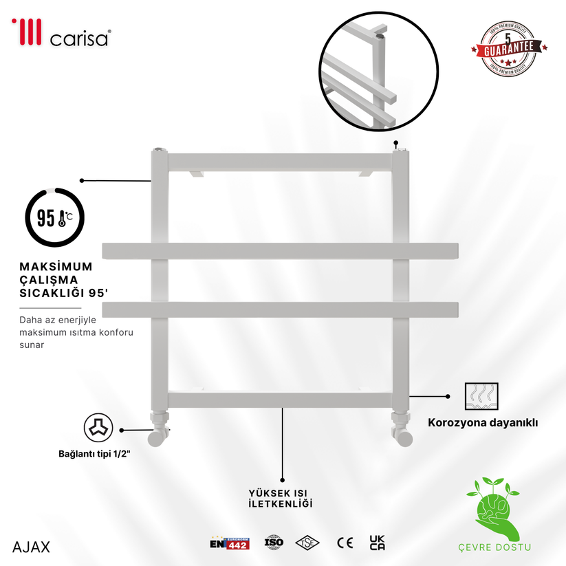 Ajax modeli alüminyum malzemesinden üretilmiş olup standart bağlantı (i̇ki yan,üst/alt,çapraz) bağlantı tipine sahiptir ve 5 yıl yıl garanti süresi sunmaktadır. 10 bar maksimum çalışma basıncı ve 95°c maksimum çalışma sıcaklığı ile güvenilir bir performans sergiler. Şık tasarımı ve parlak eloksal, beyaz, antrasit sunan geniş renk yelpazesiyle mekanlarınıza estetik bir dokunuş katmaktadır.