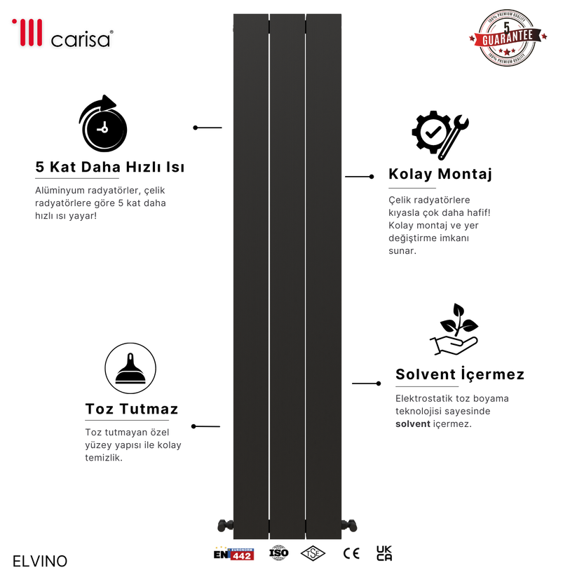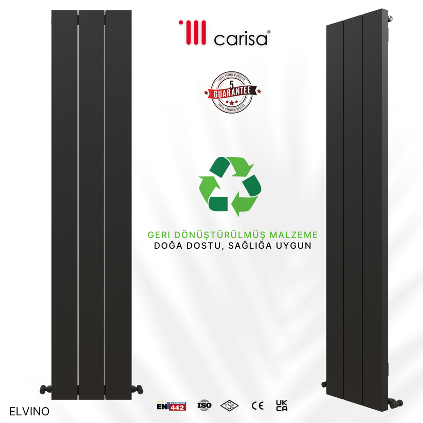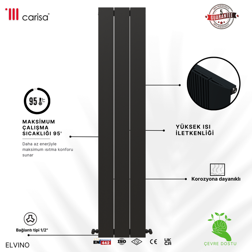 Elvino modeli alüminyum malzemesinden üretilmiş olup standart bağlantı (i̇ki yan,üst/alt,çapraz) bağlantı tipine sahiptir ve 5 yıl yıl garanti süresi sunmaktadır. 10 bar maksimum çalışma basıncı ve 95°c maksimum çalışma sıcaklığı ile güvenilir bir performans sergiler. Şık tasarımı ve beyaz, siyah, parlak beyaz, parlak eloksal, koyu gri, mat eloksal sunan geniş renk yelpazesiyle mekanlarınıza estetik bir dokunuş katmaktadır.