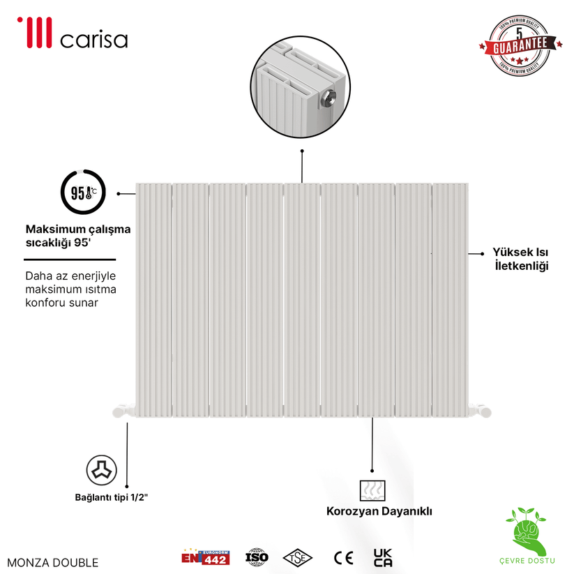 Monza modeli alüminyum malzemesinden üretilmiş olup standart bağlantı (i̇ki yan,üst/alt,çapraz) bağlantı tipine sahiptir ve 5 yıl yıl garanti süresi sunmaktadır. 10 bar maksimum çalışma basıncı ve 95°c maksimum çalışma sıcaklığı ile güvenilir bir performans sergiler. Şık tasarımı ve parlak eloksal, antrasit, beyaz, siyah sunan geniş renk yelpazesiyle mekanlarınıza estetik bir dokunuş katmaktadır.