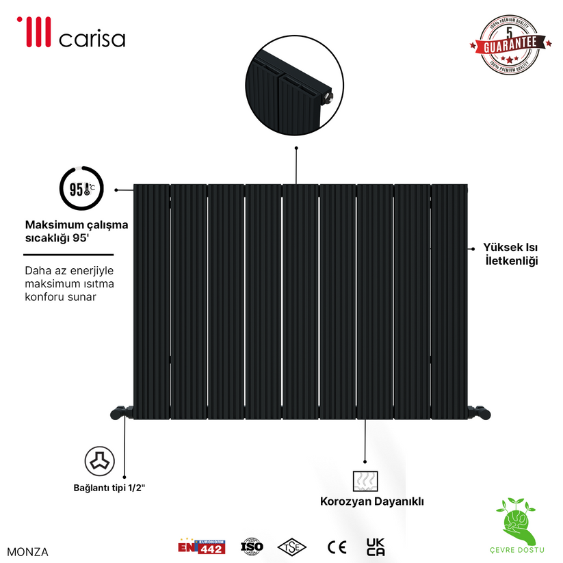 Monza modeli alüminyum malzemesinden üretilmiş olup standart bağlantı (i̇ki yan,üst/alt,çapraz) bağlantı tipine sahiptir ve 5 yıl yıl garanti süresi sunmaktadır. 10 bar maksimum çalışma basıncı ve 95°c maksimum çalışma sıcaklığı ile güvenilir bir performans sergiler. Şık tasarımı ve parlak eloksal, antrasit, beyaz, siyah sunan geniş renk yelpazesiyle mekanlarınıza estetik bir dokunuş katmaktadır.