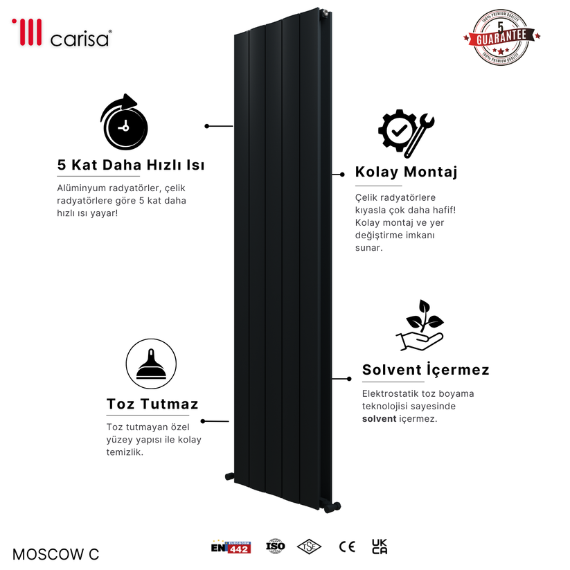 Moscow C modeli alüminyum malzemesinden üretilmiş olup standart bağlantı (i̇ki yan,üst/alt,çapraz) bağlantı tipine sahiptir ve 5 yıl yıl garanti süresi sunmaktadır. 10 bar maksimum çalışma basıncı ve 95°c maksimum çalışma sıcaklığı ile güvenilir bir performans sergiler. Şık tasarımı ve beyaz, antrasit sunan geniş renk yelpazesiyle mekanlarınıza estetik bir dokunuş katmaktadır.